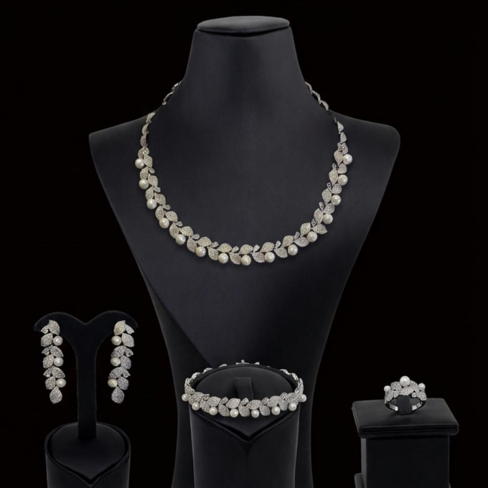 عبارة عن مجموعة مكونة من أربع قطع من المجوهرات ( عقد - أقراط - خاتم - اسوارة ) بتصميم أنيق يتناسب مع جمالك