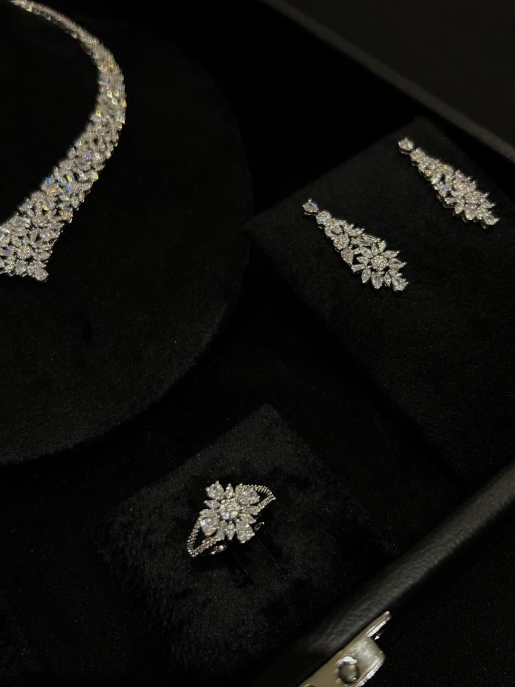 عبارة عن مجموعة مكونة من أربع قطع من المجوهرات ( عقد - أقراط - خاتم - اسوارة ) بتصميم أنيق يتناسب مع جمالك